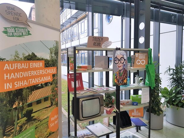 Im Foyer des Landratsamtes befindet sich ein Tauschregal. Unter dem Motto “Tauschen.Teilen.Spenden” sind alle eingeladen, Dinge zu bringen oder mitzunehmen. Wer möchte, kann eine kleine Spende für das Schulprojekt in Siha hinterlassen.